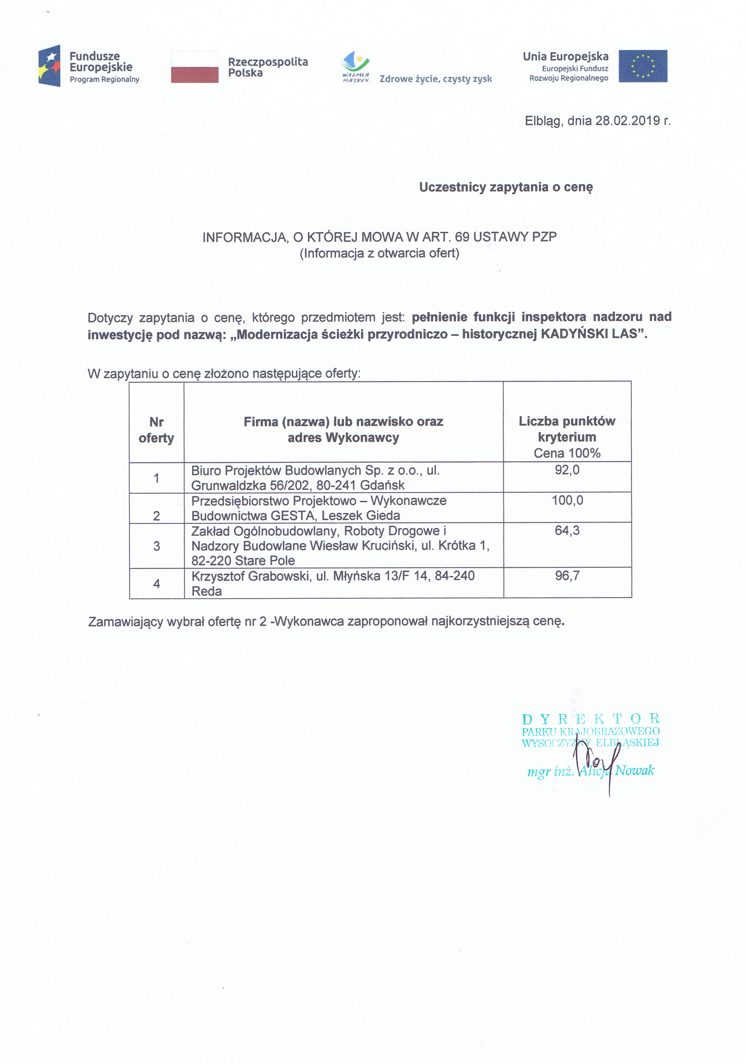 Na podstawie § 22 Regulaminu udzielania zamówień publicznych stanowiącego załącznik do Zarządzenia nr 7/2018 z dnia 22 października 2018 roku Dyrektora Parku Krajobrazowego Wysoczyzny Elbląskiej opracowanego na potrzeby realizacji projektu pn. "Podniesienie standardu bazy technicznej i wyposażenia parków krajobrazowych województwa warmińsko-mazurskiego w ramach Regionalnego Programu Operacyjnego Województwa Warmińsko-Mazurskiego na lata 2014 - 2020" zapraszam do złożenia oferty na pełnienie funkcji inspektora nadzoru inwestorskiego.