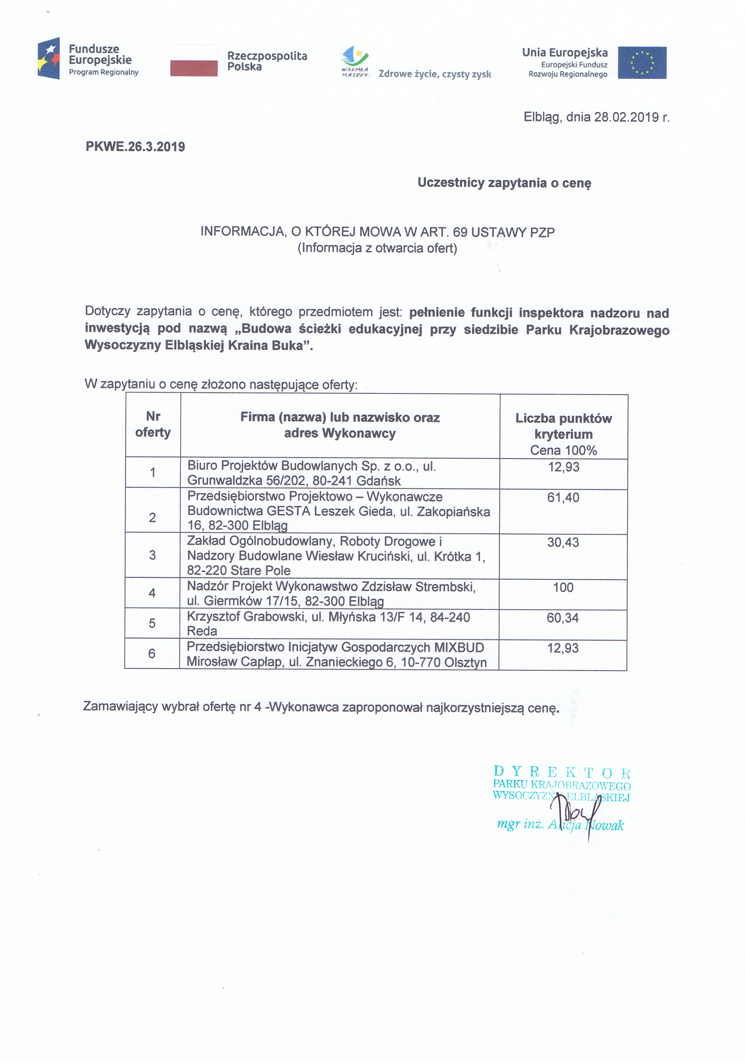 Na podstawie § 22 Regulaminu udzielania zamówień publicznych stanowiącego załącznik do Zarządzenia nr 7/2018 z dnia 22 października 2018 roku Dyrektora Parku Krajobrazowego Wysoczyzny Elbląskiej opracowanego na potrzeby realizacji projektu pn. "Podniesienie standardu bazy technicznej i wyposażenia parków krajobrazowych województwa warmińsko-mazurskiego w ramach Regionalnego Programu Operacyjnego Województwa Warmińsko-Mazurskiego na lata 2014 - 2020" zapraszam do złożenia oferty na pełnienie funkcji inspektora nadzoru inwestorskiego.
